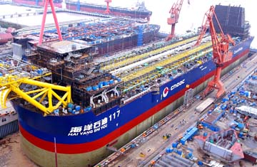 8日,我國迄今為止建造的噸位最大、造價最高、技術(shù)最新的30萬噸海上浮式生產(chǎn)儲油船“海洋石油117號”在上海外高橋造船有限公司順利下水。據(jù)悉,該船造價高達2.4億美元,船東是美國康菲石油公司,是我國出口美國的最大宗機電產(chǎn)品。