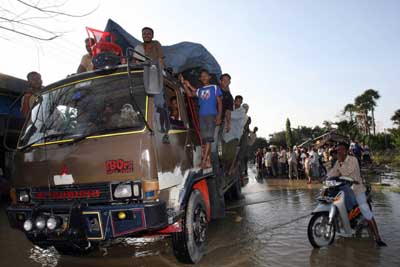 25日,在印度尼西亞亞齊的蘭沙,當?shù)鼐用翊畛似囯x開自己的家園。印度尼西亞亞齊特區(qū)官員當天說,當?shù)匾延?9.8萬居民因暴雨引發(fā)的洪災而被迫轉移。