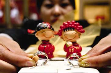 隨著新年的到來,結(jié)婚新人陡然增多,見證愛情的信物“鉆戒”熱銷起來。記者4日在北京新東安商城的億龍鉆石了解到,近期,它們的鉆戒一天能賣出十多個(gè)。圖為一位工作人員在展示一對“情侶鉆戒”。