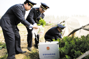 近日,來自北京市工商局通州分局的食品檢測(cè)員與河北省香河縣工商局執(zhí)法人員聯(lián)手對(duì)蔬菜種植基地、批發(fā)市場(chǎng)上銷售的蔬菜進(jìn)行了抽檢,將監(jiān)管關(guān)口前移到田間地頭,以確保進(jìn)京食品源頭的安全。焦艷玲 攝