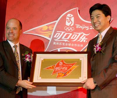 1月10日,可口可樂公司負(fù)責(zé)奧運(yùn)事務(wù)的官員魯大韋(左)向北京奧組委官員贈(zèng)送該公司為北京2008年奧運(yùn)會(huì)特別設(shè)計(jì)的奧運(yùn)會(huì)組合標(biāo)志的模型。