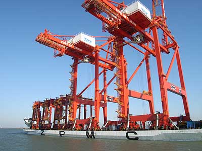 圖為天津港購買的世界上最先進(jìn)的集裝箱碼頭裝卸設(shè)備。隨著天津?yàn)I海新區(qū)的快速發(fā)展,天津港口建設(shè)進(jìn)一步提速,2006年完成固定資產(chǎn)投資76.4億元,今年投資將達(dá)85億元,重點(diǎn)建設(shè)東疆保稅港區(qū)和25萬噸級深水航道。天津港目前已成為世界最大的人工深水港。