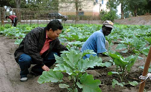2月6日,在塞內(nèi)加爾的桑加勒卡姆中國援助塞內(nèi)加爾農(nóng)業(yè)技術(shù)培訓(xùn)中心,中國援塞農(nóng)業(yè)技術(shù)組組長、高級農(nóng)藝師楊廷明(左)在示范田指導(dǎo)當(dāng)?shù)貙?shí)習(xí)人員培植蔬菜。中國于2006年11月向塞內(nèi)加爾派遣了首批農(nóng)業(yè)技術(shù)專家,對當(dāng)?shù)剞r(nóng)民進(jìn)行蔬菜和水稻種植技術(shù)培訓(xùn)。