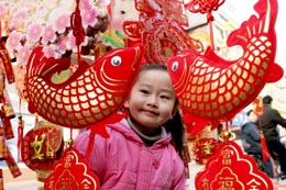 2月11日,安徽淮北的年貨市場(chǎng)紅紅火火,節(jié)目飾品琳瑯滿目,吸引了孩子們的目光。