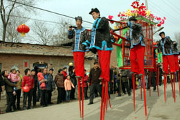 “高抬花轎”是河南省沁陽市山王莊鎮(zhèn)萬南村傳承了400多年的獨(dú)特民間技藝,由八名轎夫腳踩一米多高的高蹺,抬著花轎進(jìn)行表演。圖為2月13日,萬南村村民在表演“高抬花轎”。