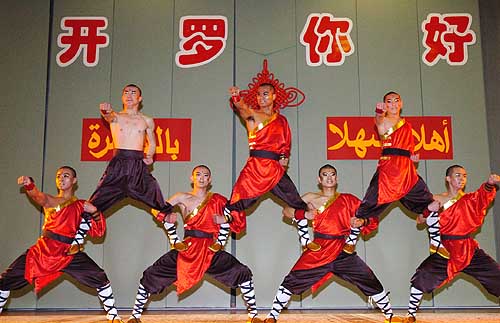 23日晚,中國藝人在埃及首都開羅國際會(huì)議中心表演中國功夫。當(dāng)日,來自北京八大廟會(huì)之一廠甸廟會(huì)的藝人們?cè)谶@里為當(dāng)?shù)厝罕姭I(xiàn)上了一場(chǎng)北京春節(jié)廟會(huì)特有的傳統(tǒng)民間藝術(shù)表演。這是中國春節(jié)廟會(huì)演出首次在埃及登臺(tái)亮相。