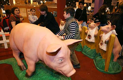 3日,在法國巴黎舉行的國際農(nóng)業(yè)博覽會上,一個用豬模型布置的展臺吸引了不少觀眾。當(dāng)天,為期9天的第44屆法國國際農(nóng)業(yè)博覽會在巴黎凡爾賽門展覽中心開幕。法國國際農(nóng)業(yè)博覽會始于1964年,是世界著名的大型農(nóng)業(yè)博覽會之一,每年該博覽會的參觀人數(shù)都多達(dá)數(shù)十萬。