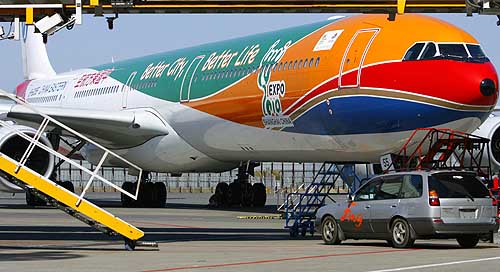 18日,中國東方航空公司的“世博號”客機(jī)降落在日本東京成田機(jī)場,中國2010年上海世博會海外區(qū)域推廣活動由此拉開帷幕。東航“世博號”客機(jī)為全長74.8米的空客A340-600型飛機(jī),機(jī)身噴繪了2010年上海世博會會徽及世博會主題“城市,讓生活更美好”的英文表述“Better City,Better Life”。