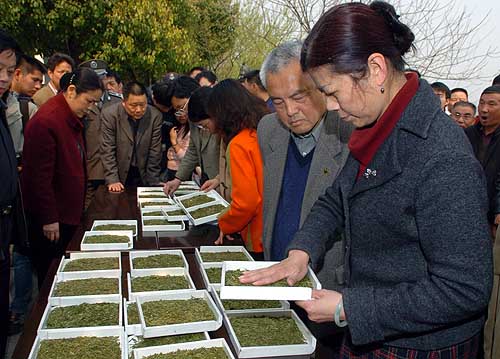 3月22日,茶葉專家正在現(xiàn)場(chǎng)查看剛剛炒制出來(lái)的西湖龍井茶的色澤。當(dāng)天,2007年西湖龍井炒茶技藝大賽在杭州舉行,30多位來(lái)自西湖龍井茶區(qū)的炒茶高手爭(zhēng)奪2007年“炒茶王”桂冠,比賽結(jié)束后,經(jīng)過(guò)專家組對(duì)茶葉色澤、香氣、湯味等指標(biāo)的嚴(yán)格評(píng)選,最后精選的200克極品西湖龍井“茶王茶”當(dāng)場(chǎng)被買家以11萬(wàn)元的天價(jià)拍走。 |