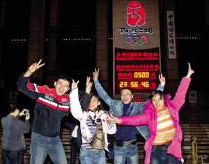 昨天(26日),幾名學(xué)生在中國國家博物館門前的2008年奧運(yùn)會倒計時牌前歡呼留影。當(dāng)晚,北京迎來2008年奧運(yùn)會倒計時500天。
