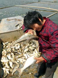 4月3日,郯城縣高峰頭鎮(zhèn)養(yǎng)殖戶周;鎸Υ笈吏~淚流滿面。當(dāng)日,山東省郯城縣高峰頭鎮(zhèn)發(fā)生網(wǎng)箱魚大面積死亡事件,16戶養(yǎng)殖戶損失慘重。事發(fā)后,當(dāng)?shù)丨h(huán)保及漁政部門的執(zhí)法人員立即趕到現(xiàn)場采集水樣,據(jù)初步判斷,死魚事件為一家酒精廠排污所致。