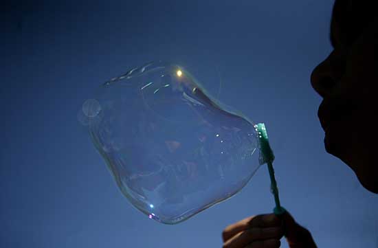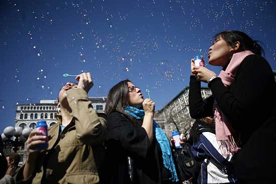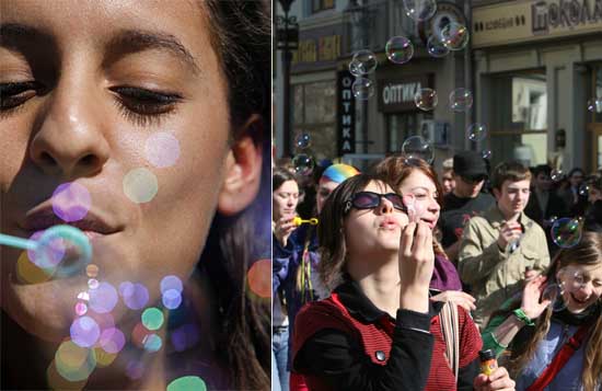 在美國(guó)紐約和俄羅斯首都莫斯科人們紛紛走上街頭吹起五彩的泡泡,享受春日的溫暖。