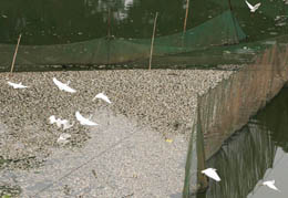 4月9日,在廣西南寧市相思湖,白鷺從漂浮著死魚的湖面上飛過(guò)。