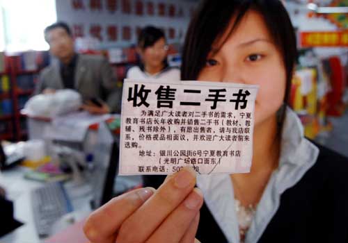 近日,銀川市教育書店增設(shè)收售“二手書”業(yè)務(wù),在提倡書籍循環(huán)再利用、環(huán)保節(jié)能的同時(shí),也滿足了部分低收入讀者對(duì)書籍換購(gòu)的需求。圖為銀川市教育書店工作人員正在介紹收售“二手書”的小告示。