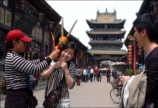 4月29日,在山西平遙古城南大街,一名游客準(zhǔn)備和一只小猴子合影留念。隨著“五一”黃金周的來臨,山西省平遙古城迎來了眾多的游客,各個(gè)景點(diǎn)開始預(yù)熱,以迎接客流高峰的到來。