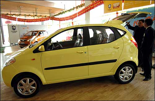 消費者正在觀看一輛長安奔奔汽車。200輛長安奔奔近日從長江重慶港裝船,踏上出口阿爾及利亞的旅程。這是長安奔奔自去年底上市并在國內(nèi)市場持續(xù)熱銷以來首次向海外出口。作為長安汽車集團(tuán)的首款自主品牌轎車,長安奔奔在低端轎車市場中憑借低價格與高配置的優(yōu)勢,對同類車型構(gòu)成嚴(yán)重威脅。短短4個月,奔奔銷量已達(dá)3萬輛。