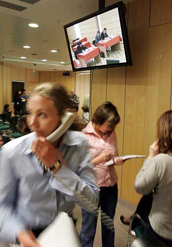 5月10日,在俄羅斯首都莫斯科的俄羅斯石油公司總部新聞中心,媒體記者觀看競拍直播。由俄羅斯政府控股的俄羅斯石油公司當(dāng)天在俄羅斯尤科斯石油公司薩馬拉地區(qū)資產(chǎn)的競拍中勝出。