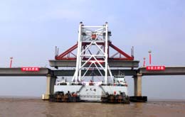 5月21日,目前世界上最長的跨海大橋——杭州灣跨海大橋混凝土結(jié)構(gòu)施工全面完成。杭州灣跨海大橋北起浙江海鹽、南至浙江寧波,全長36公里,總投資118億元,預(yù)計(jì)2007年建成,2008年通車。圖為“小天鵝”架梁船正將最后一片2200噸重、70米長的巨型箱梁架設(shè)在跨海大橋的橋墩上。