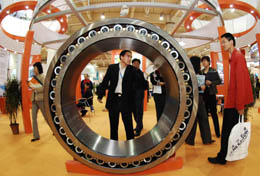 5月23日,參觀者在博覽會上觀看展出的大型軸承。