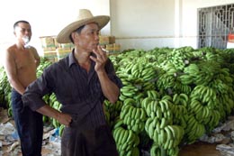 5月24日,海南瓊海市塔洋鎮(zhèn)農(nóng)民面對(duì)低迷的香蕉價(jià)格愁容滿面。近日,關(guān)于“香蕉含類似SARS病毒”的信息在國(guó)內(nèi)部分手機(jī)用戶間流傳。農(nóng)業(yè)部市場(chǎng)司副司長(zhǎng)張興旺認(rèn)為,“香蕉含類似SARS病毒”的說(shuō)法是沒(méi)有任何科學(xué)依據(jù)的,純屬謠言。海南香蕉市場(chǎng)因這條短信出現(xiàn)波動(dòng),雖銷量沒(méi)什么影響,但是在價(jià)格上每500克下降了0.1至0.2元。 |