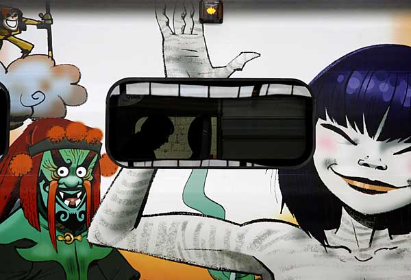 29日,在英國倫敦尤斯頓車站,一位乘客坐在車身外畫滿漫畫的列車車廂內(nèi)。近日,一位英國設(shè)計師以大幅漫畫的形式為他的最新歌劇作品《猴子:西游記》在列車車廂外做宣傳。