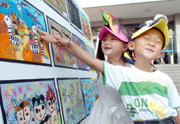 5月31日,臨滄市第一幼兒園的小朋友王卓(右)在向另一位小朋友介紹自己的美術(shù)作品。當(dāng)日,云南省臨滄市第一幼兒園舉行歡慶“六一”兒童節(jié)活動(dòng),小朋友們通過(guò)繪畫(huà)、舞蹈、歌唱等活動(dòng)充分展示自己的才能。