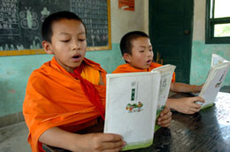 5月31日,身穿僧衣的臨滄市忙畔中心學(xué)校忙令小學(xué)四年級傣族學(xué)生俸新明(左)與俸中發(fā)在自習(xí)。這個(gè)學(xué)校貧困寄宿生每學(xué)年的生活補(bǔ)助增加了一百元。 2007年春季學(xué)期起,云南省投入6.2億元大幅提高農(nóng)村義務(wù)教育階段貧困家庭寄宿學(xué)生生活補(bǔ)助標(biāo)準(zhǔn),小學(xué)生由每生每學(xué)年150元提高到250元,初中生由每生每學(xué)年250元提高到350元,享受學(xué)生人數(shù)達(dá)200萬人。 |