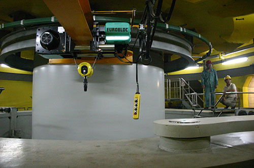 6月11日,工程技術人員在對率先投入運營的22號機組進行監(jiān)測。當日,三峽工程右岸電站首臺機組——22號機組經(jīng)過一個多月的調(diào)試運行,正式并網(wǎng)發(fā)電,投入運營。這標志著三峽三期工程開始發(fā)揮效益。