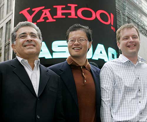 | 美國(guó)著名網(wǎng)絡(luò)搜索公司“雅虎”6月18日宣布重大高層變動(dòng),原任董事長(zhǎng)兼首席執(zhí)行官的特里·塞梅爾辭去首席執(zhí)行官職務(wù),公司創(chuàng)始人之一、美籍華人楊致遠(yuǎn)出任首席執(zhí)行官,從而重掌雅虎門(mén)戶(hù)。這張2005年3月2日拍攝的資料照片顯示,楊致遠(yuǎn)(中)與塞梅爾(左)以及“雅虎”公司另一創(chuàng)始人菲洛在美國(guó)時(shí)報(bào)廣場(chǎng)合影。