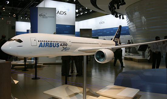在剛剛閉幕的第47屆巴黎國際航展上,空中客車公司全面展示了從A320到A380各系列飛機,共獲得了425架確認(rèn)訂單和303架承諾訂單,創(chuàng)造了新紀(jì)錄。這張拍攝于6月23日的照片顯示的是空中客車展臺展出的A350寬體飛機模型。