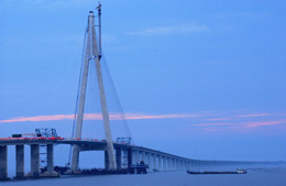 6月26日,杭州灣跨海大橋全線貫通。這座世界上最長(zhǎng)的跨海大橋北起浙江嘉興海鹽縣,南至浙江寧波慈溪市,全長(zhǎng)36公里,橫跨整個(gè)杭州灣,工程總投資約118億元。該跨海大橋按雙向六車道高速公路設(shè)計(jì),設(shè)計(jì)時(shí)速100公里,設(shè)計(jì)使用壽命100年以上,建成后將縮短寧波至上海間的陸路距離120公里。