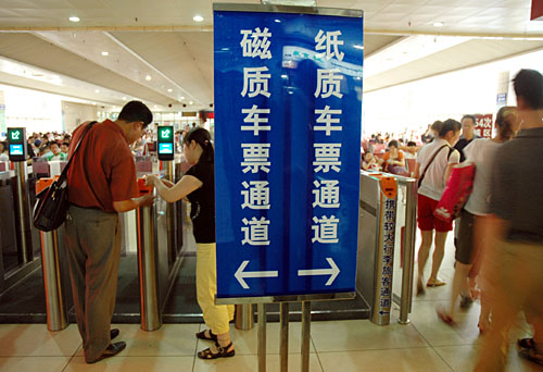 7月5日,上;疖囌緞榆嚱M候車室分磁質(zhì)和紙質(zhì)車票通道。近日,乘客在鐵路上海站和上海南站乘坐部分動車組列車,可選擇購買磁卡火車票,傳統(tǒng)的紙質(zhì)車票仍適用。
