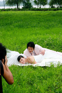 7月15日,一對(duì)新人在江蘇省盱眙縣淮河沿岸風(fēng)光帶拍攝婚紗照。