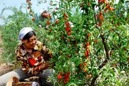 7月16日,寧夏銀川市西夏區(qū)蘆花鎮(zhèn)金田村村民汪秀英在采摘枸杞。 近日,寧夏枸杞進(jìn)入采摘季節(jié),25萬農(nóng)戶搶摘枸杞。2007年枸杞收購價格上漲,平均每公斤超過27元,較上年同期高出八元以上。近年來,寧夏積極扶持和發(fā)展枸杞種植和加工產(chǎn)業(yè),種植面積超過45萬畝,產(chǎn)值已達(dá)到15億元;10萬多農(nóng)戶依靠枸杞產(chǎn)業(yè)脫貧致富,40多萬人參與枸杞種植和深加工創(chuàng)收。 |