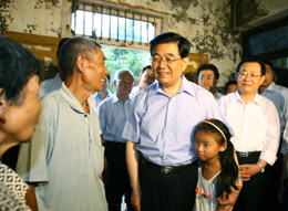 7月21日至22日,中共中央總書記、國家主席、中央軍委主席胡錦濤在重慶市考察工作,看望受災群眾。這是胡錦濤在沙坪壩區(qū)回龍壩鎮(zhèn)梁灘橋村馮洪元家中了解受災情況,鼓勵他們增強戰(zhàn)勝災害的決心和勇氣,盡快恢復生產(chǎn)、重建家園。