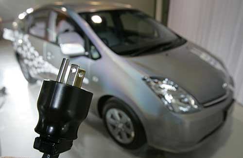 7月25日,日本豐田汽車公司在東京為該公司一種混合燃料動(dòng)力車舉行的發(fā)布會(huì)上,一名工作人員展示可在常規(guī)插座上為車充電的充電器插頭。這種混合燃料動(dòng)力車在燃油的狀態(tài)下最高時(shí)速可達(dá)100公里。該車也可以在普通電源插座上充電,充電三到四個(gè)小時(shí)后行駛,時(shí)速可達(dá)13公里。