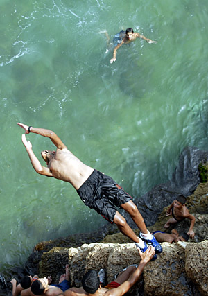 7月28日,在以色列北部海濱城鎮(zhèn)阿克,一名男孩從海邊古城墻上縱身躍入大海。近一周來,以色列全境持續(xù)干旱高溫天氣,最高平均溫度達(dá)到35攝氏度以上,局部超過40攝氏度。到海邊游泳度假成了以色列人最主要的休閑活動(dòng)。