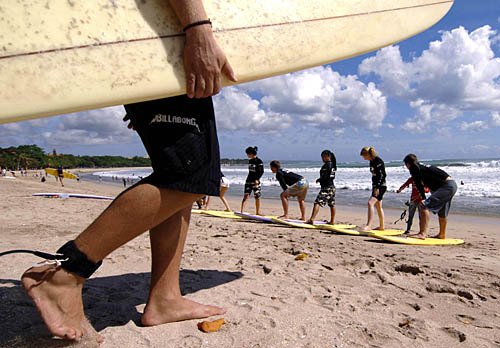 8月2日,外國游客在印度尼西亞旅游勝地巴厘島的庫塔海灘參加沖浪學習班。印尼統(tǒng)計部門的最新數(shù)據(jù)顯示,2007年上半年來巴厘島旅游的游客數(shù)量增長1/3。巴厘島人氣旺盛,直接推動印尼全國的旅游業(yè)復蘇。