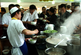 7月31日,蘭州市一家牛肉面館,市民在排隊(duì)就餐。 7月份以來(lái),蘭州市物價(jià)局對(duì)蘭州牛肉面施行“限價(jià)”,大碗牛肉面價(jià)格不得超過(guò)2.5元,小碗不得超過(guò)2.3元!皟r(jià)格禁令”實(shí)施后,價(jià)格低廉實(shí)惠的牛肉面依然是市民青睞的對(duì)象。目前蘭州市大部分牛肉面館生意火暴。 |
