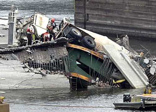 6日,清理小組的工作人員在美國明尼蘇達州密西西比河橋梁坍塌事故現場工作。