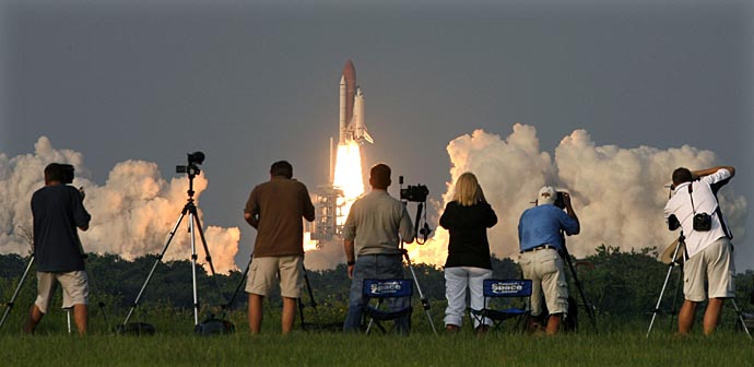 8日,攝影記者在美國佛羅里達州肯尼迪航天中心附近拍攝“奮進”號航天飛機發(fā)射升空的鏡頭。美國東部時間18時36分(北京時間9日6時36分),美國“奮進”號航天飛機載著機組7名宇航員從佛羅里達州肯尼迪航天中心發(fā)射升空,飛往國際空間站。這是“奮進”號時隔近5年來,首次執(zhí)行飛行任務(wù)。