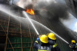 8月16日,上海消防人員在黃浦體育館滅火。當(dāng)天上午10點(diǎn)25分許,上海黃浦體育館突發(fā)大火,三至四樓的竹制腳手架大面積燃燒,當(dāng)時(shí)許多工人被困其中。10點(diǎn)30分,兩輛消防車趕到現(xiàn)場(chǎng),10分鐘后火勢(shì)得到控制。事故原因及具體損失情況還在調(diào)查中。