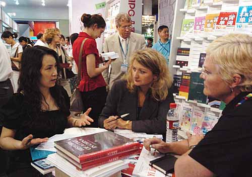 8月30日,來自南非的書商在圖博會(huì)上與外文出版社的負(fù)責(zé)人(左)商談購買有關(guān)圖書版權(quán)事宜。