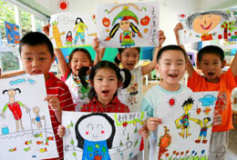 9月8日,幾名蘇州教育幼兒園大班的孩子展示自己創(chuàng)作的繪畫。