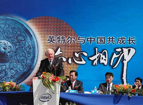 9月8日,美國英特爾公司大連芯片廠奠基典禮在大連經(jīng)濟(jì)技術(shù)開發(fā)區(qū)舉行。根據(jù)中美雙方簽訂的合作協(xié)議,美國英特爾公司大連芯片廠首期投入25億美元,項目建設(shè)期為5年。正在大連參加夏季達(dá)沃斯年會的美國英特爾公司董事會主席克瑞格·貝瑞特、大連市市長夏德仁出席奠基典禮出席奠基典禮。這是美國英特爾公司董事會主席克瑞格·貝瑞特在典禮上致辭。