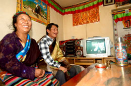 9月10日,兩位藏族老人在唐古拉山鄉(xiāng)生態(tài)移民小區(qū)自己家中收看電視節(jié)目。 從2003年國(guó)家實(shí)施三江源生態(tài)保護(hù)建設(shè)項(xiàng)目以來(lái),整個(gè)三江源地區(qū)已有6000多戶、三萬(wàn)多人從生態(tài)惡化嚴(yán)重地區(qū)搬遷出來(lái),并在政府的幫助下融入城鎮(zhèn)。預(yù)計(jì)到2010年時(shí),三江源地區(qū)為保護(hù)當(dāng)?shù)厣鷳B(tài)環(huán)境而實(shí)施搬遷的藏族牧民將達(dá)到10萬(wàn)人。