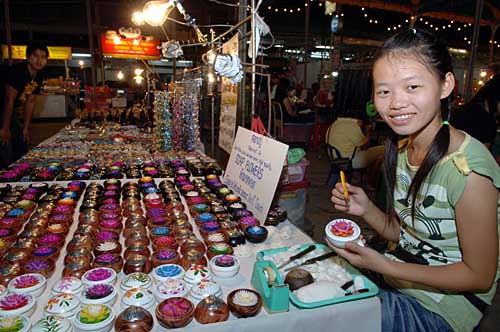 9月15日,一位小姑娘在泰國(guó)清邁長(zhǎng)康路夜市上制作燭花和皂花。清邁是泰國(guó)第二大城市,也是泰國(guó)北部政治、經(jīng)濟(jì)和文化中心,這里曾長(zhǎng)期作為泰國(guó)納蘭王朝的首都。清邁人秉承了世代相傳的手工藝技巧,使清邁成為全球最大的手工藝品制造中心之一。每當(dāng)夜幕降臨,各種手工藝品匯集的清邁長(zhǎng)康路成為最讓游客心儀神往的繁華夜市。