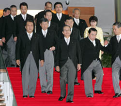 26日,在日本東京首相官邸,日本新首相福田康夫(前中)與內(nèi)閣成員集體亮相。當天上午,日本福田康夫內(nèi)閣在皇宮舉行認證儀式后正式成立。