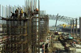 10月8日,工人們在安徽阜陽站工地施工。 目前,安徽省阜陽火車站改造工程已進入百日倒計時階段,中鐵四局的建設者們正緊張施工,確保按時、高質(zhì)量完工。阜陽站是全國主要的民工集散地之一,每年發(fā)送旅客590多萬人次,其中85%以上是農(nóng)民旅客,被當?shù)厝罕娪H切地稱為“農(nóng)民車站”。