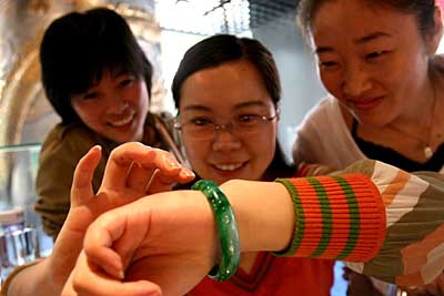 圖為消費(fèi)者試戴一只價(jià)格昂貴的翡翠手鐲。日前,一家以零售為主、同時(shí)兼營(yíng)珠寶租賃業(yè)務(wù)的珠寶店在北京市朝陽(yáng)區(qū)開(kāi)業(yè)。據(jù)介紹,珠寶租賃業(yè)務(wù)主要針對(duì)10萬(wàn)元以上的高檔產(chǎn)品,顧客可以花較少的錢(qián)租用到價(jià)值昂貴的豪華珠寶首飾。